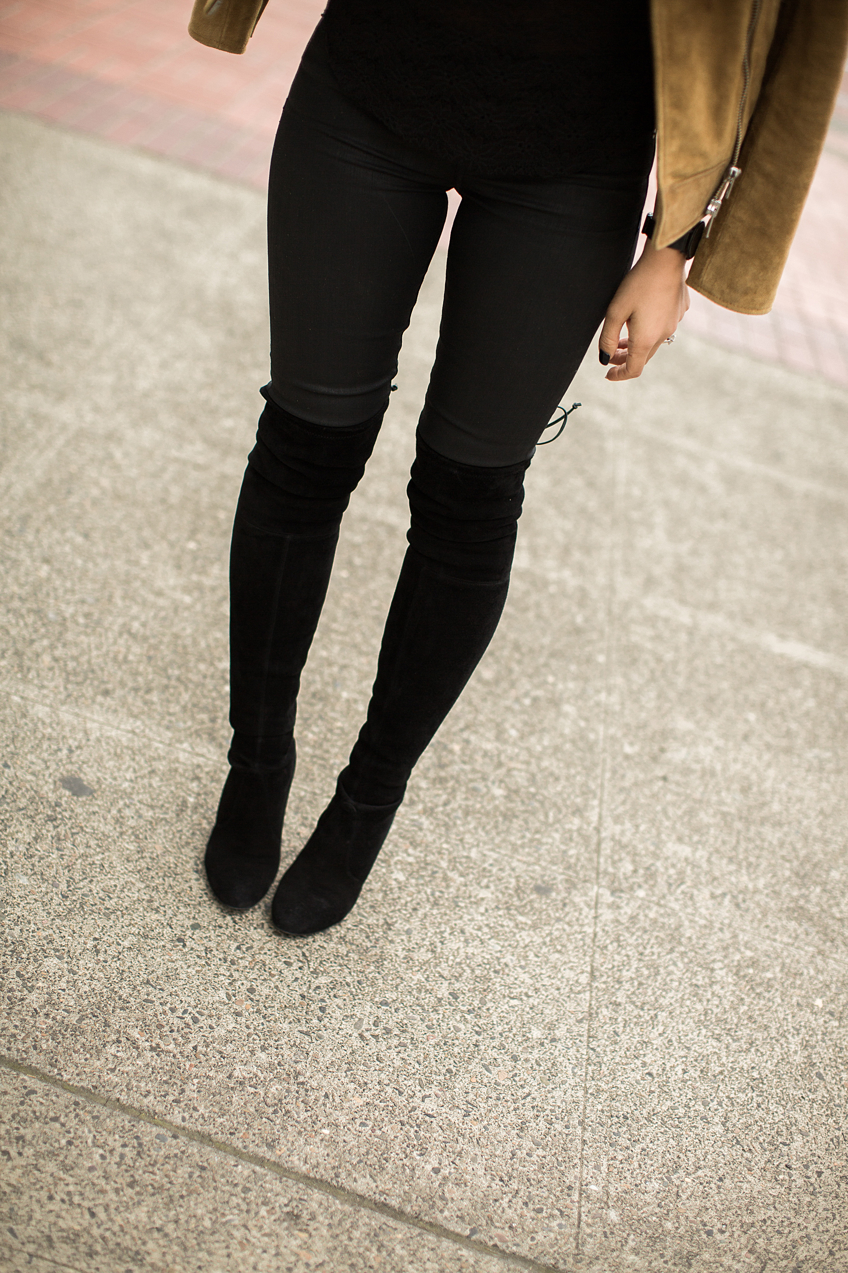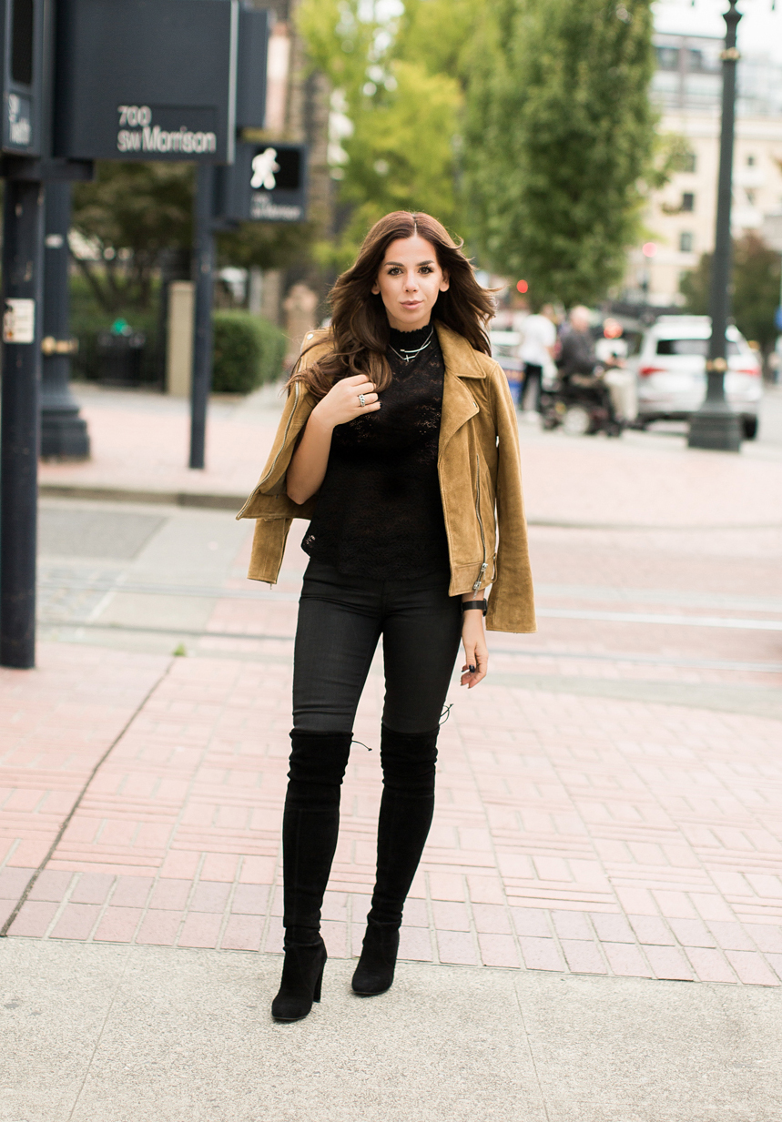 This suede jacket I’m wearing was one of my favorite buys this year. The color and fit is so good and matches just about everything so you can pair it with high-rise skinny jeans with over-the-knee boots with v-neck tee or with ruffle neck lace tank that i’m wearing for street style or errands as with a pretty sweater dress or shirt dress for date. Feel confident and beautiful in a look that matches the season. Thanks for stopping by, xoxo.